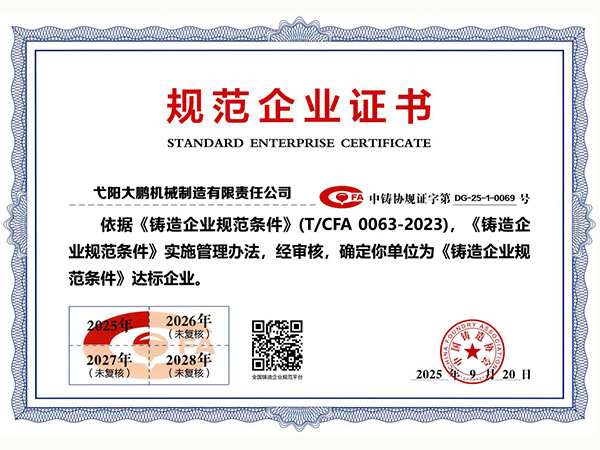 公司順利通過質量管理體系認證、環境體系認證、職業健康安全管理體系認證、環評。2015年5月獲國家工信委頒發的《鑄造企業準入條件》;2019年做了安全現狀評價;2020年取得了排污許可證。